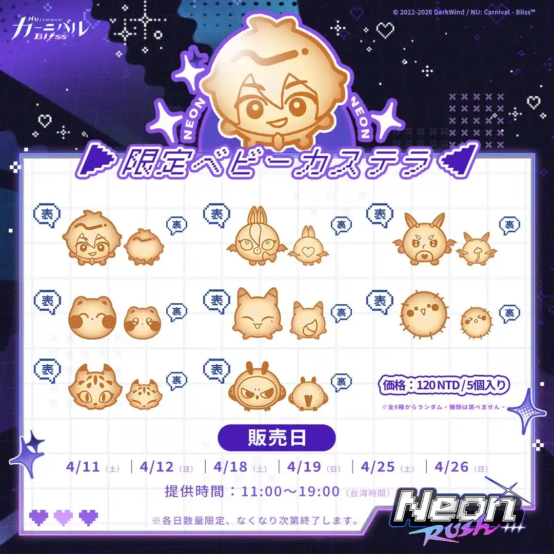 大人気BLスマホゲーム『NU: カーニバル』の4周年アニバーサリーPOP UPストア「Neon Carnival -Neon Rush-」が11日に、台湾台北の華山1914文化創意産業園区 中7B館にて盛大にオープンしました!会場では新作「Neon Carnival -Neon Rush-」及び「Neon Carnival -The 4th anniversary-」の商品が展開され、さらには香ばしい超キュートなデザインの限定ベビーカステラも登場し、大勢のファンを迎えました。 |