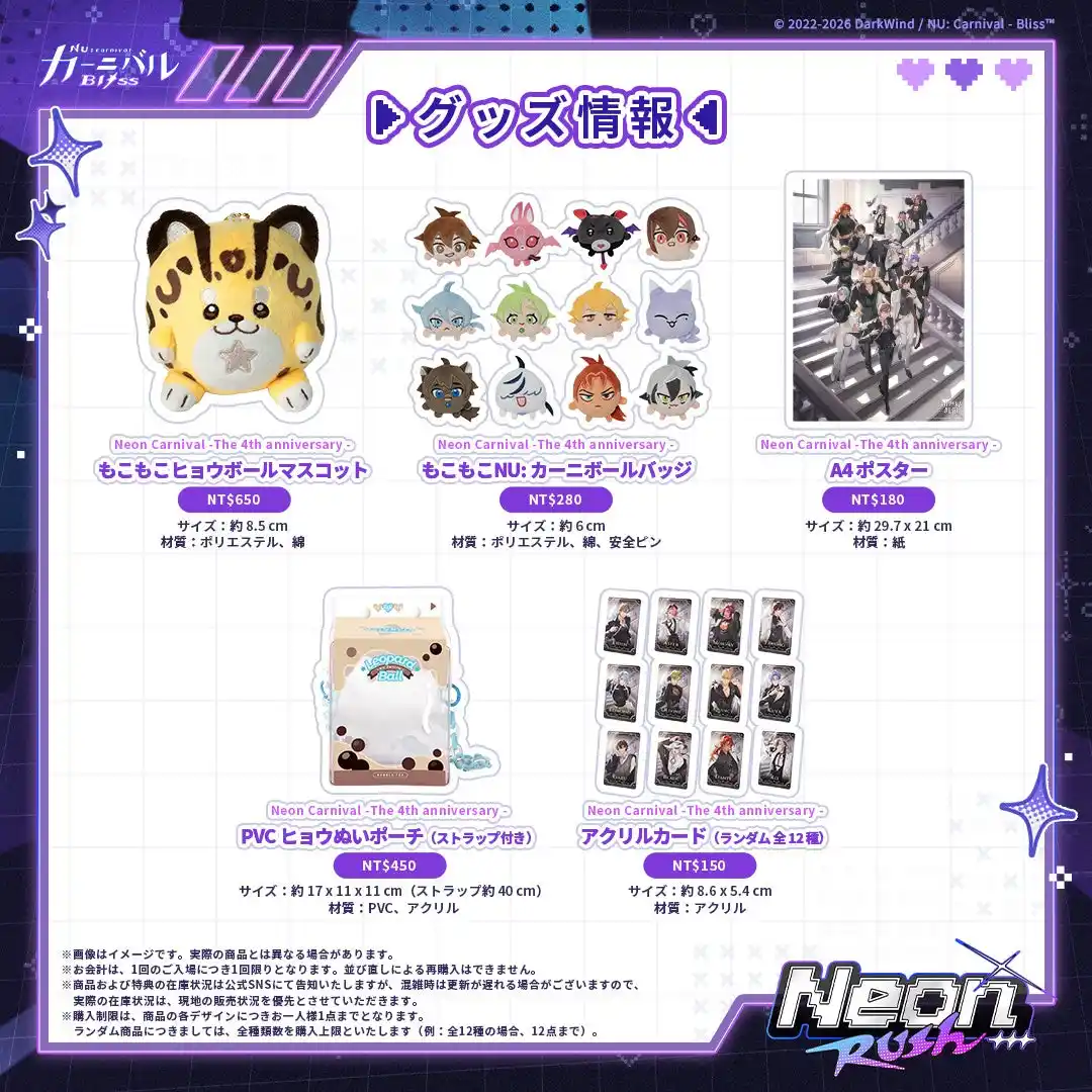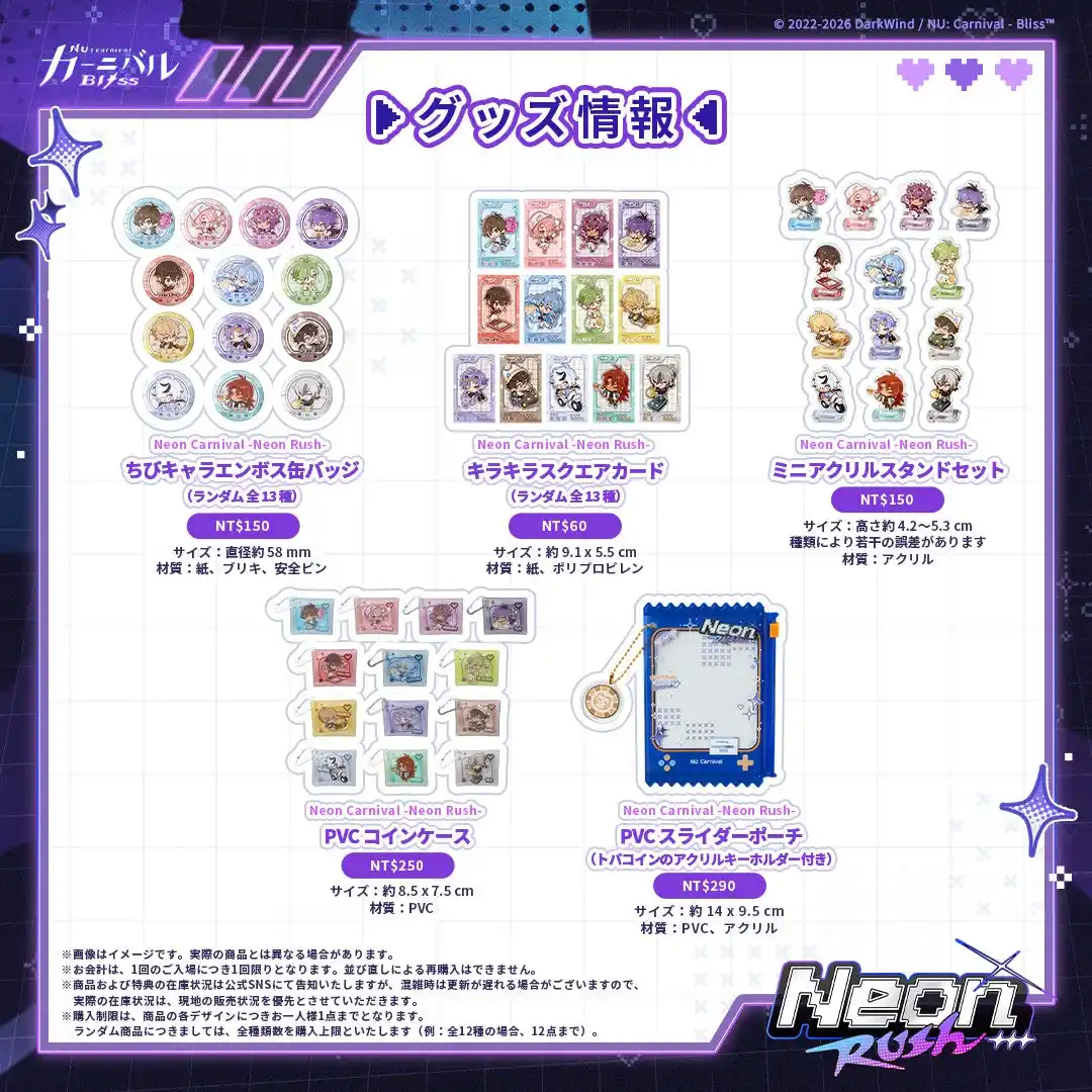 「Neon Rush」と「Neon Carnival -The 4th anniversary-」の関連商品が会場にて発売中!お買い上げ金額に応じて、素敵な限定特典をプレゼント! |