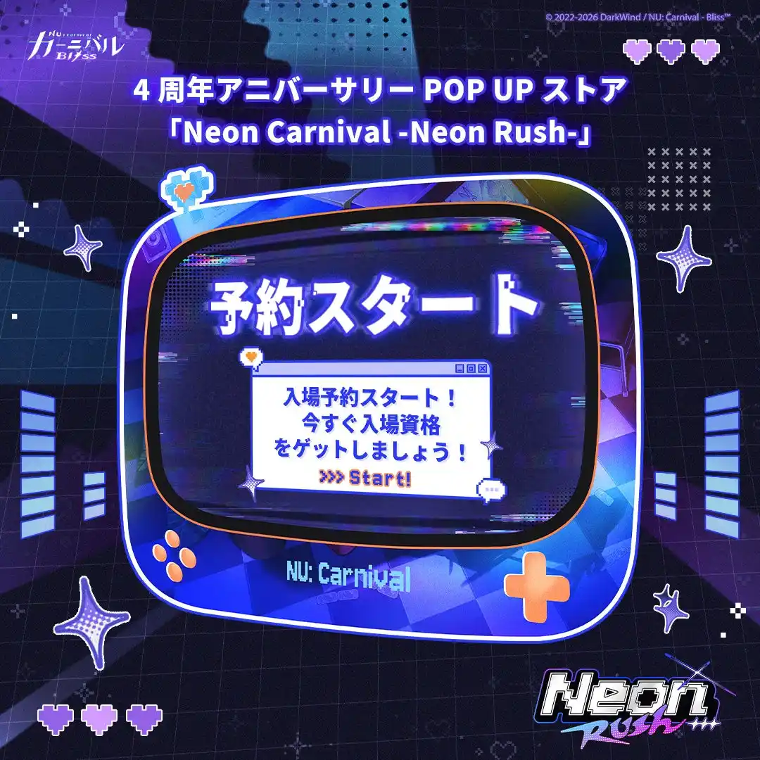 『NU: カーニバル』4周年アニバーサリーPOP UPストア「Neon Carnival -Neon Rush-」は充実した内容をお届けします。ステキな限定グッズを手に入れるこの貴重な機会を、どうぞお見逃しなく!POP UPストア開催期間中、ACCUPASSチケットシステムにて0円チケットを購入いただく事前予約入場が主となります。現地でのチケット販売、予約、発券サービスは行っておりません。 |