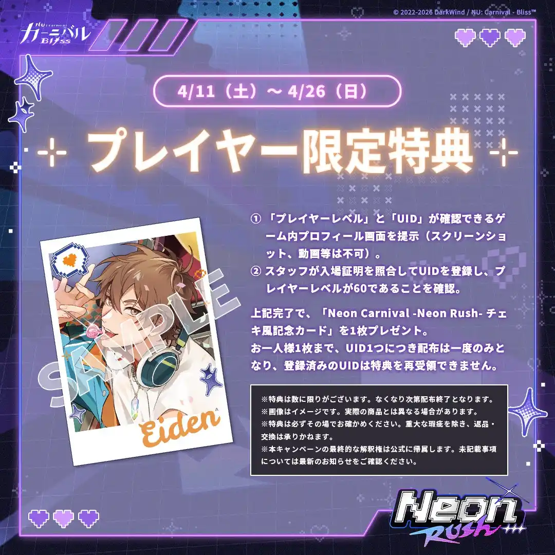 さらに、会場ではプレイヤー限定のプレゼントキャンペーンも実施されます。ご来場の際に、ゲーム内の「プレイヤーレベル」と「UID」が表示されたプロフィール画面をご提示ください(スクリーンショット、動画等は不可)。スタッフが入場証明の確認とUIDの登録を行い、プレイヤーレベルが60の方に、「Neon Carnival -Neon Rush- チェキ風記念カード」を1枚プレゼントいたします。 |