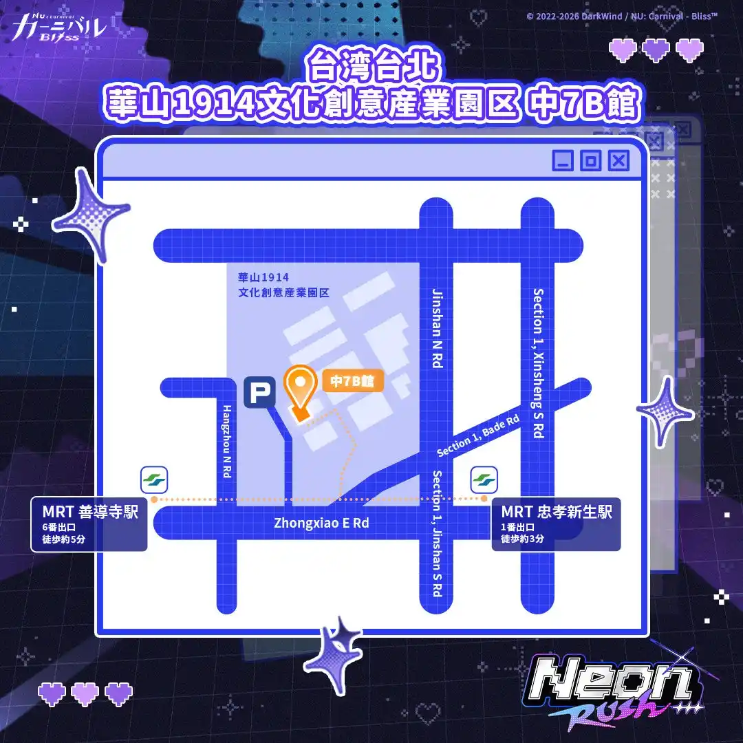 POP UPストア開催期間中、会場限定のSNS投稿キャンペーンが実施されます。POP UPストア会場内で写真または動画を撮影し、Facebook / X / Instagram / Plurk / Threads のいずれかのプラットフォームで、指定のハッシュタグ「#NeonRush」を付けて公開設定でシェアしてください。投稿画面と当日の入場証明をスタッフが確認後、限定特典「Neon Carnival -Neon Rush- キラキラ記念ステッカー」を1枚プレゼント(全6種・ランダム)。異なるSNSにそれぞれ投稿した場合、お一人様最大2枚までお受け取りいただけます。 |