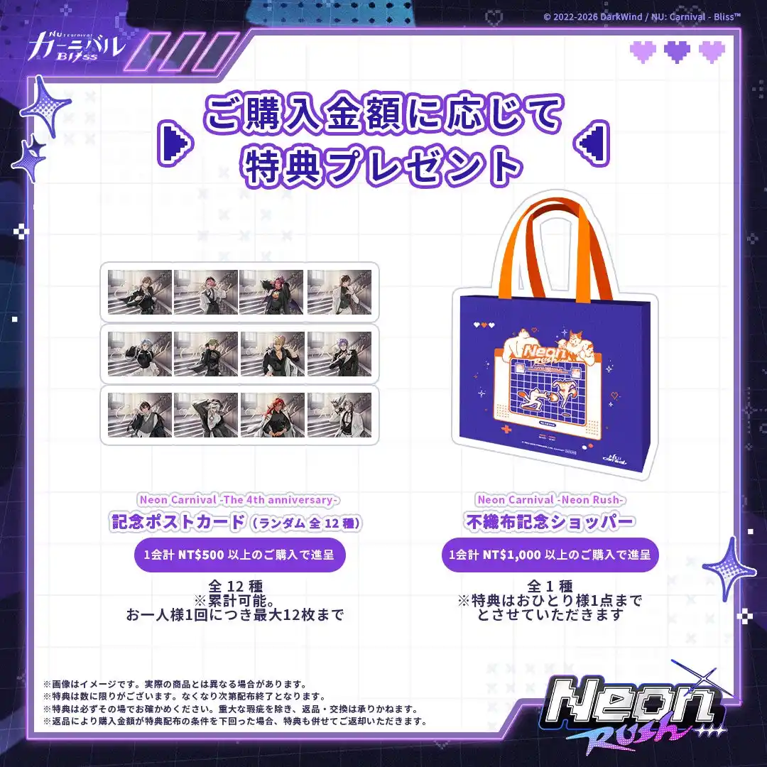 会場では1回のお会計につき、500NTD 購入ごとに「Neon Carnival -The 4th anniversary- 記念ポストカード(ランダム 全 12 種)」を1枚プレゼント(お一人様1回のお会計につき、最大12枚まで受け取れます)。また、1回のお会計につき、1,000 NTD以上ご購入で「Neon Carnival -Neon Rush- 不織布記念ショッパー(全1種)」を1点プレゼント(こちらの特典はお一人様1点までとなります)。特典は本イベント限定品につき、数に限りがございます。なくなり次第終了となりますので、あらかじめご了承ください。 |