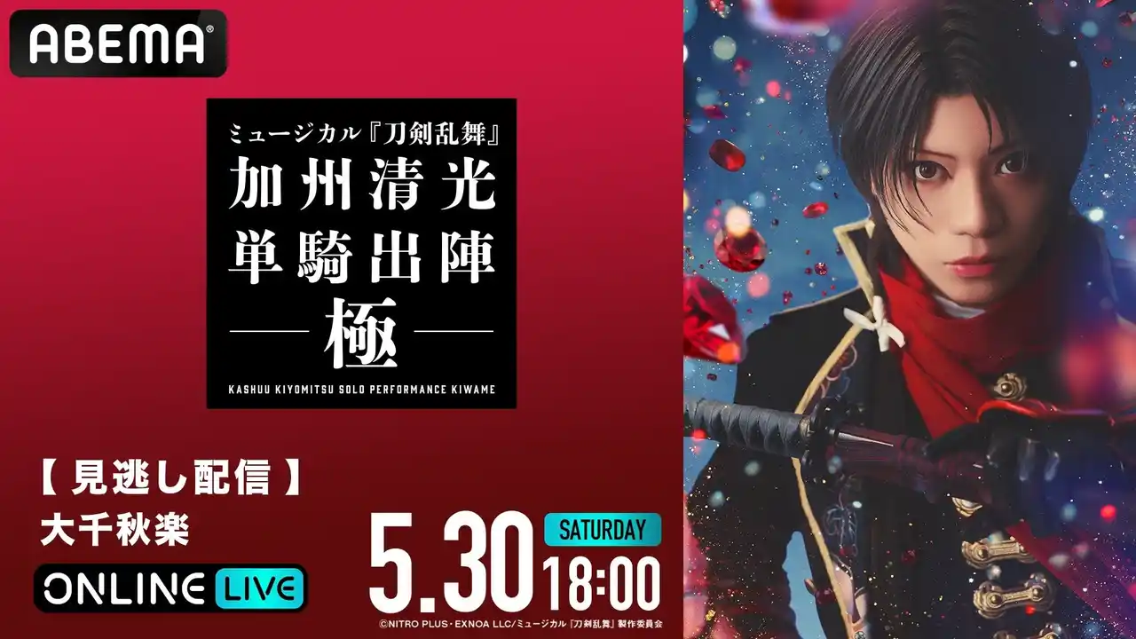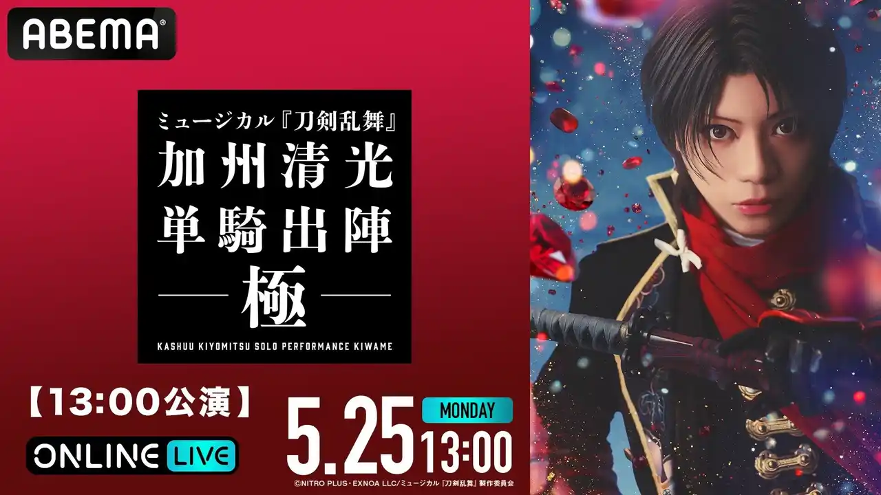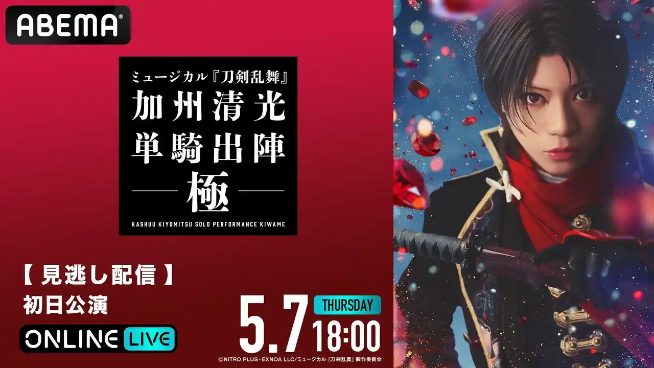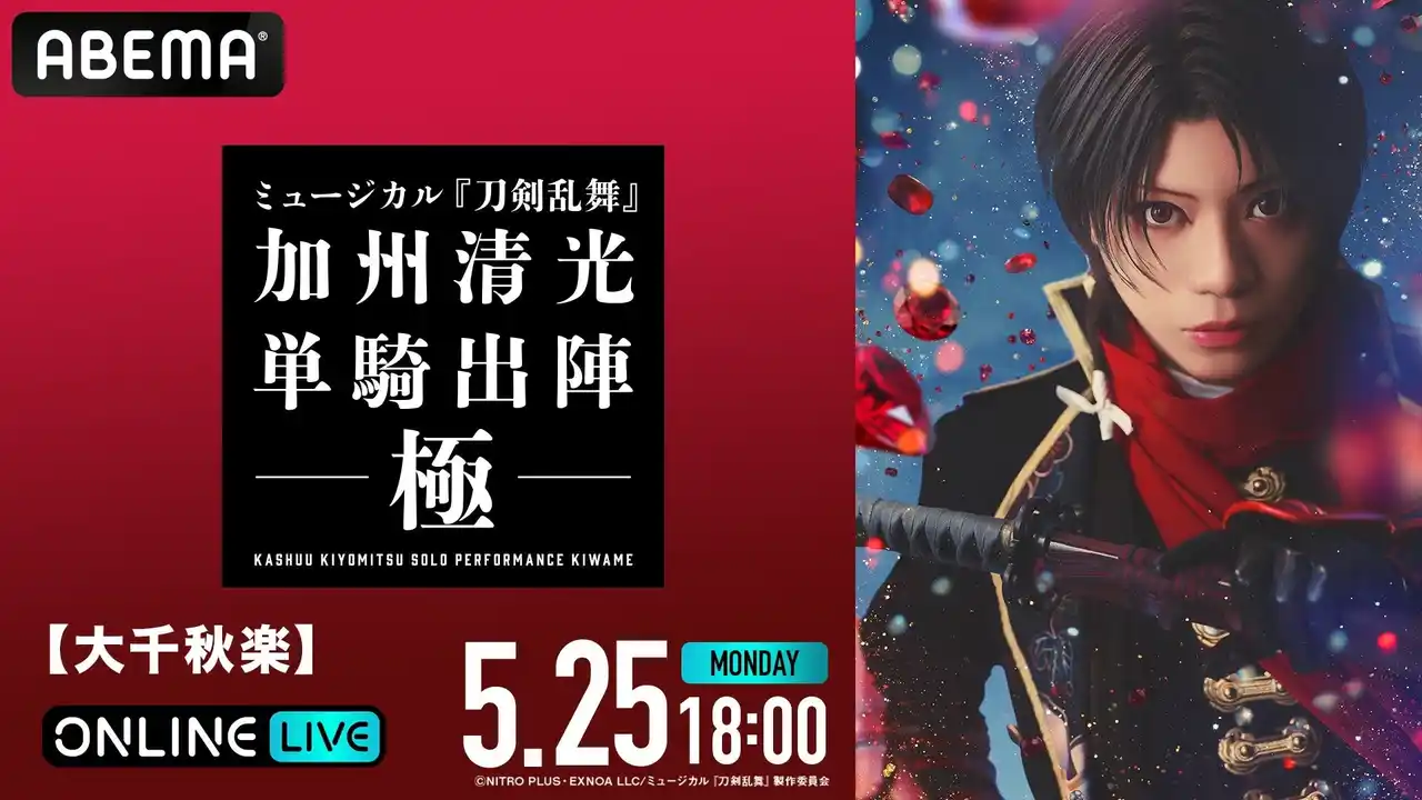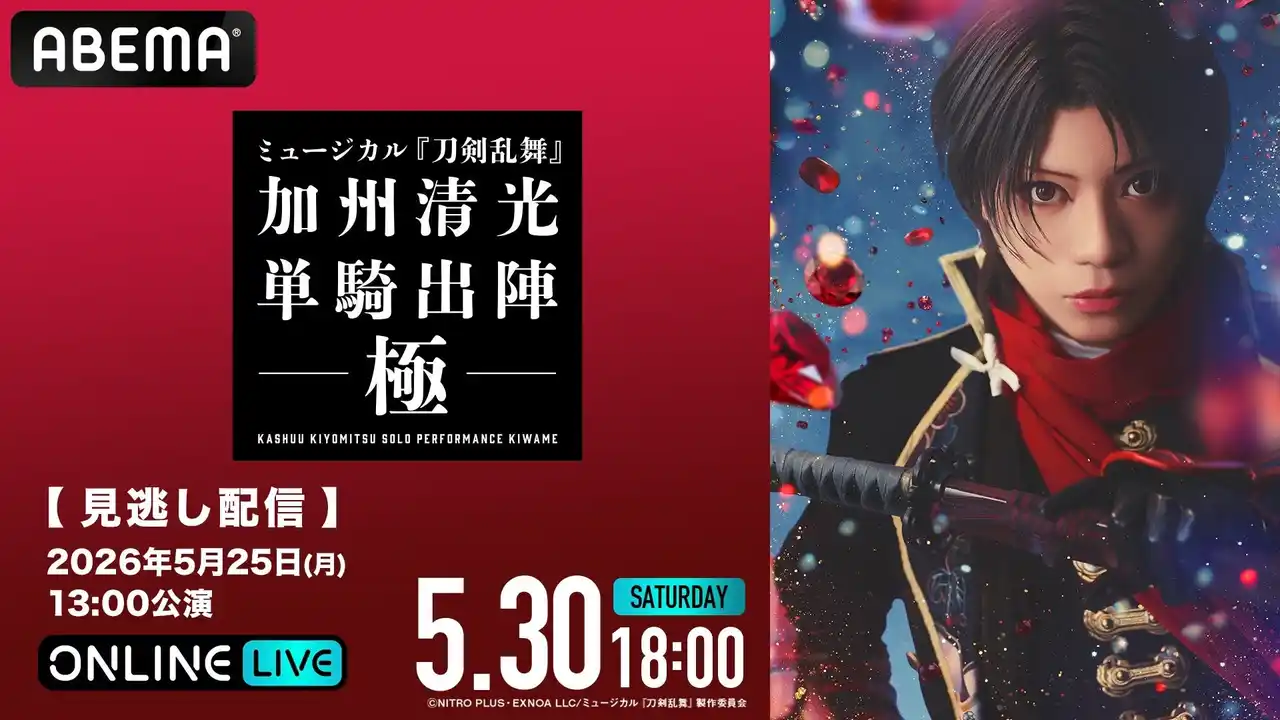新しい未来のテレビ「ABEMA」は、「ABEMA PPV(アベマ ペイパービュー)」にて、ミュージカル『刀剣乱舞』 加州清光 単騎出陣 極の2026年5月1日(金)初日公演、5月25日(月)13時公演、および同日18時からの大千秋楽公演を生放送することを決定いたしました。また、本公演のチケットを2026年4月13日(月)13時より発売開始いたします。 |