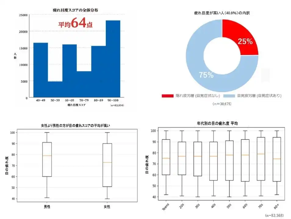 体験者の平均疲れ目度スコアは64点。60点以上の方で6割を超え、80点以上の方で4割を占めました。80点以上の人はモニター視聴時間に差がないにもかかわらず、「デジタルダメージ」「瞼の重み」「日中の眠気」を強く感じている傾向が見られました。疲れ目のスコアが80点以上の方のうち4人に1人は自覚症状を感じていないサイレント層でした。本人は無自覚でも、実際には目は疲れている可能性があることも示唆されました。 |