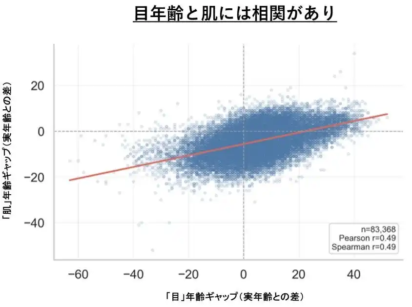 「目」年齢と「肌」年齢のギャップには正の相関関係が見いだせました。 |