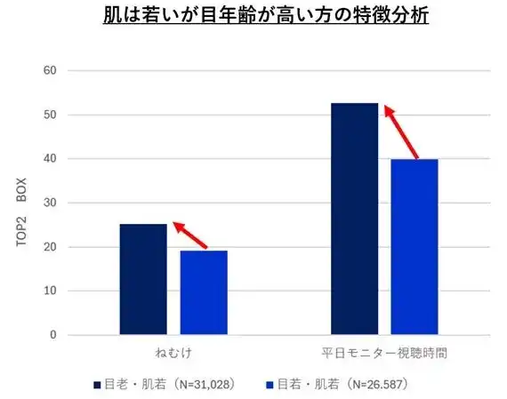 ・ 肌スコアは若いのに「目」年齢が実年齢より高い方が4割もいて、この層を比較分析すると、日中の眠気を感じている人が多く(TOP2差分:6.0pt)、またモニターの視聴時間が長い(TOP2差分:12.3pt)ことが確認されました。肌が若くても油断大敵。『目』で損をしているかもしれません。モニター視聴時間がもたらしうる『目年齢』の格差が示唆されました。 |