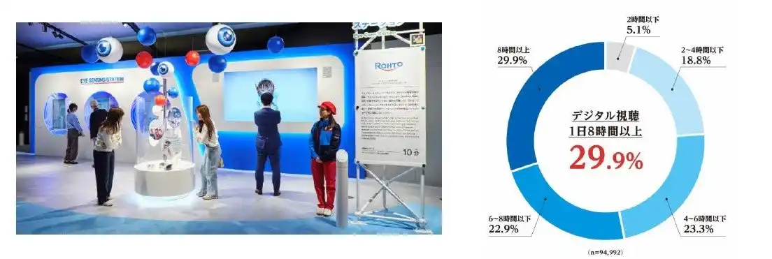 ロート製薬株式会社(本社:大阪市、社長:瀬木英俊)は、2025年日本国際博覧会(大阪・関西万博)の大阪ヘルスケアパビリオンに出展した「ミライのアイケア」ブースにおいて、体験者10万人以上※1の目の健康データを収集・解析しました。その結果、約3割の方が平日8時間以上デジタル視聴を行い、視聴時間が長い人ほど目の不調を実感する割合が高いことが判明。さらに、「目年齢」※2を一つの指標として、現代人が抱える目の実態や肌との関係が明らかとなってきました。