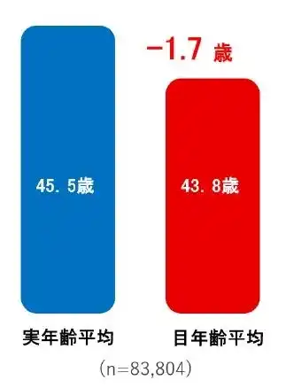 ・ 万博会場で測定する「目年齢」、平均は43.8歳となり、実年齢の平均(45.5歳)を下回る結果となりました。 |