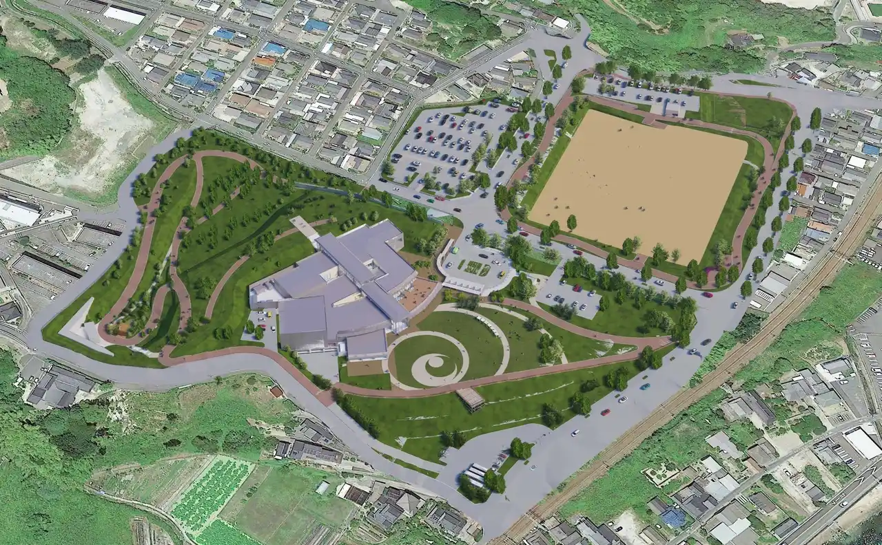 | ふれあい交流施設や自然交流施設、健康増進施設などの機能も一体に。ひな壇状(テラス)の地形や瀬戸内海の眺望を最大限に活かした、ここでしか体験できない「いこい」と「学び」の拠点へ。 |