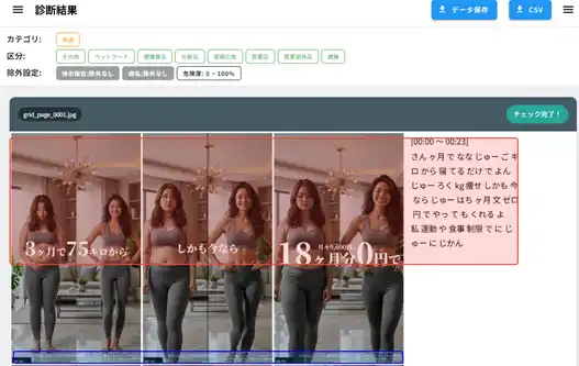 また、単にNG表現を指摘するだけでなく、推奨表現の提示にも対応しているため、修正の初動を早めやすい設計となっています。動画については自動でカットごとに確認し、ナレーションも含めてチェック可能です。さらに、企業独自のポリシーや媒体ごとの審査レギュレーション、現場で蓄積された修正ルールをAIに学習させることで、より運用実態に即したチェック体制の構築を支援します。 |