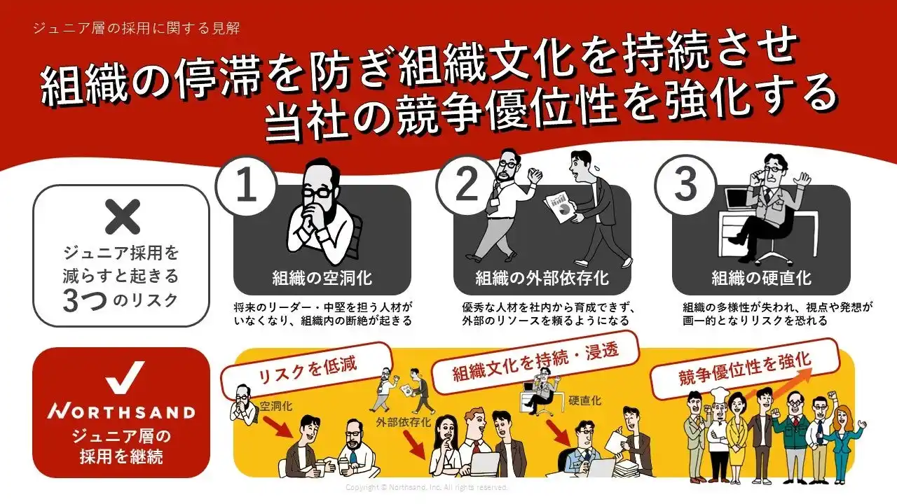 | また、ジュニア採用を減少させると、次世代のリーダーを担う人材がいなくなる「空洞化」や不足する人材を外部からの採用に頼る「外部依存化」、画一的でリスクを取ることを恐れる「硬直化」などのリスクが高まると考えております。 | |||||||