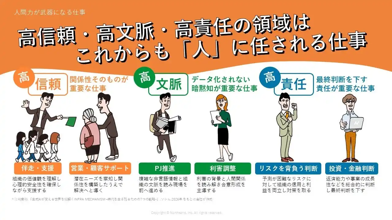 | コンサルティングという仕事は、お客様との信頼関係や組織内の暗黙知、重要な意思決定を伴う非定型業務であり、「この人だから任せられる」といった"人"に依拠する要素が大きい仕事です。AI単体では構造的に代替が難しい領域と考えています。 | |||||||