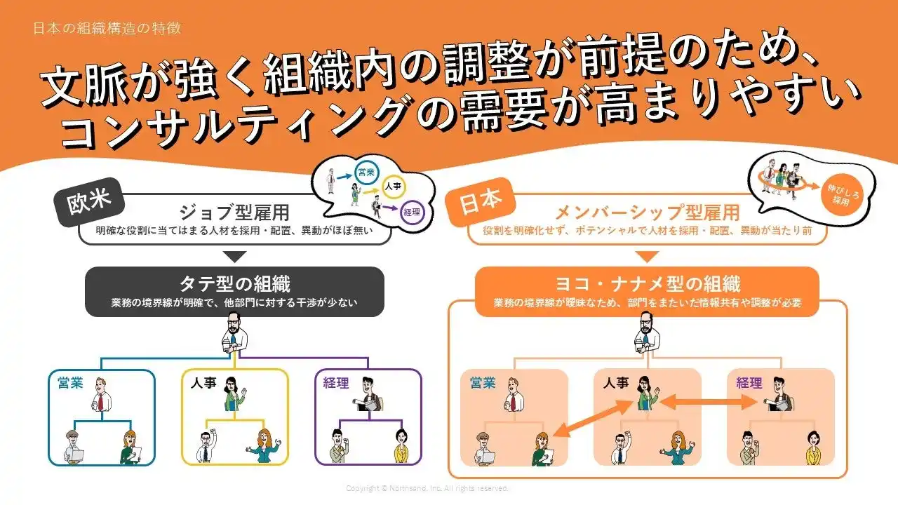 | また、日本では、雇用習慣や独自の組織構造※1 に起因して、コンサルティングの需要が高まりやすいと考えています。日本は、メンバーシップ型雇用の習慣やハイコンテキストなコミュニケーション文化があり、部署間の調整コストが構造的に大きく、欧米のような急速な内製化は進みにくい構造にあると考えています。 | |||||||