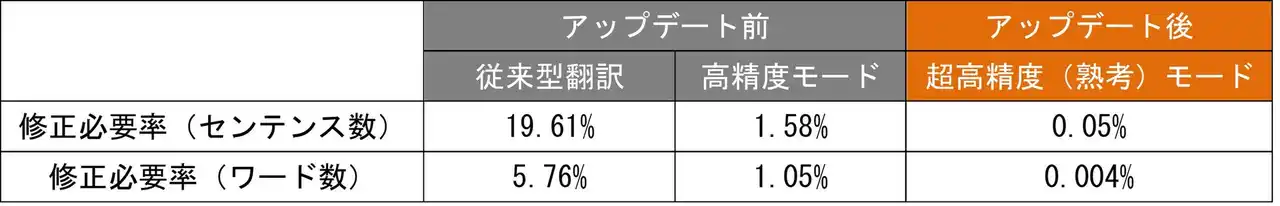 ※数値は、日本語から英語への翻訳の場合に人手修正が必要なワード数およびそれに相当するセンテンス数。センテンス数ベースで修正必要率0.05%は100~200ページに1センテンス程度。 |