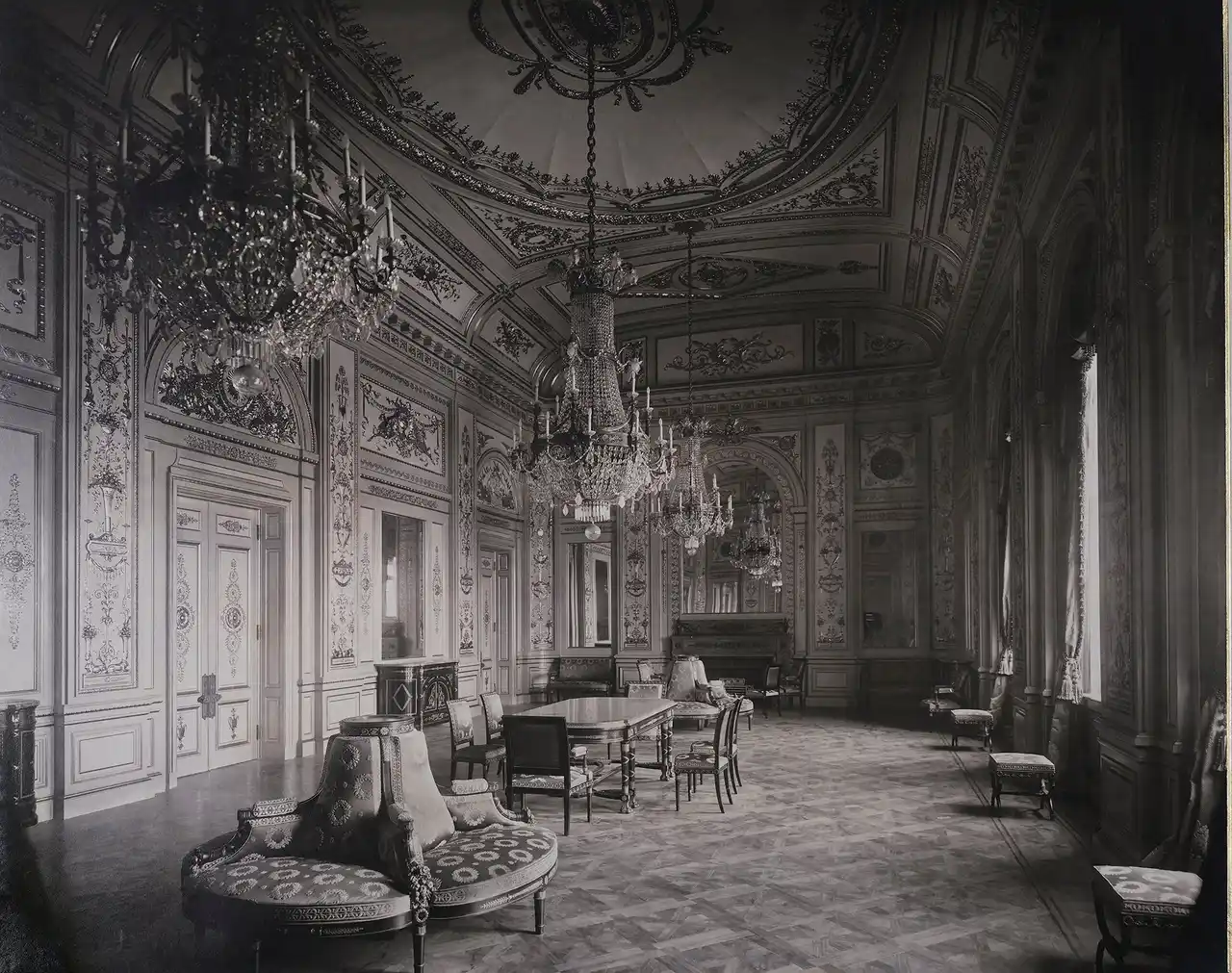東宮御所の竣工時のようすを写真師・小川一真が撮影。本展では東宮御所で実際に使用された家具もあわせて展示! |