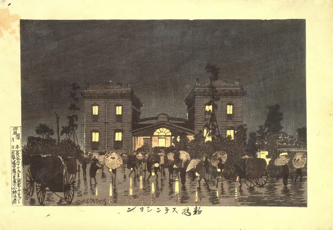 闇夜に浮かぶ駅舎を「光線画」の画家・小林清親が詩情豊かに描いた |