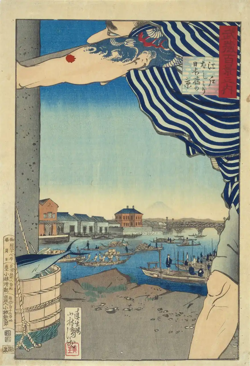「東亰海運橋第一国立銀行の全図 并近円の市中一覧の図」 歌川芳虎/画 1876年(明治9) 東京都江戸東京博物館蔵【後期:7月28日-8月23日】 |