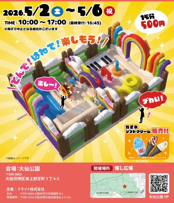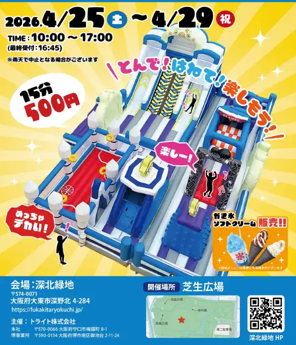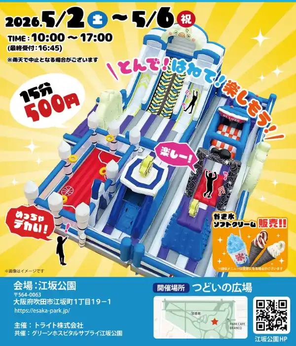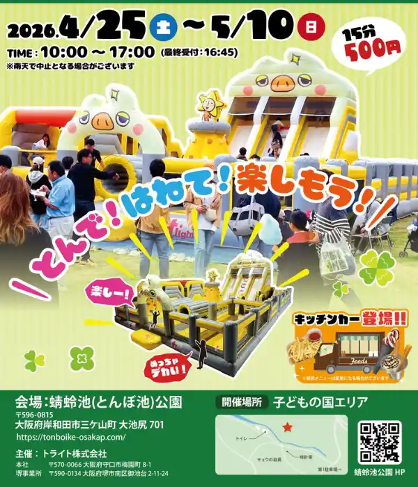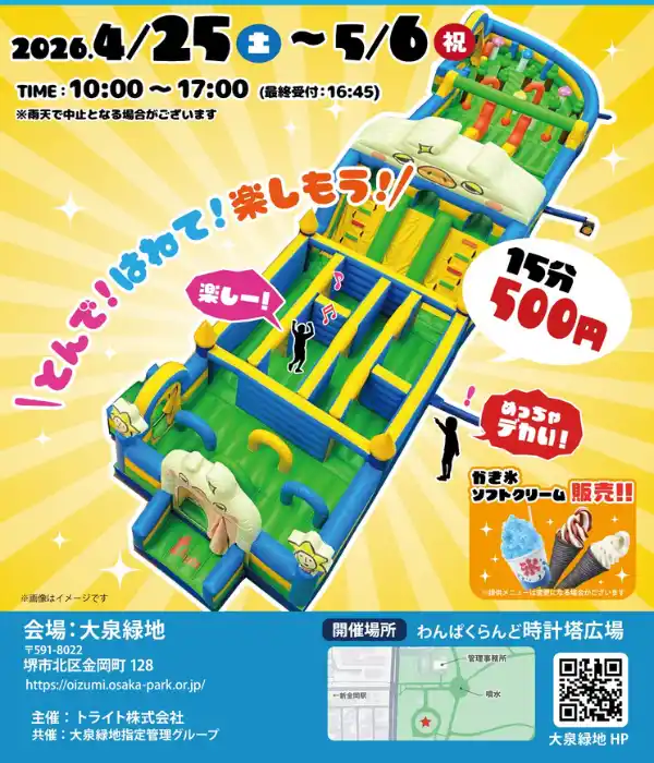 トライト株式会社(本社:大阪府守口市、代表:山田 康生)は、2026年4月25日(土)から5月10日(日)までの16日間、3歳から小学生以下のお子様を対象とした大型エア遊具イベント「ぽよぽよ遊具フェスティバル2026」を開催いたします。会場は大阪府内の公共地公園や兵庫県、滋賀県のテーマパークの計8カ所となります。 |