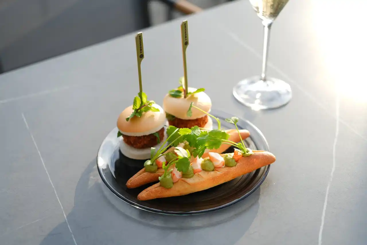 はじまりには、スパークリングワインまたはティーモクテルよりお好みの一杯をお選びいただき特別な始まりを演出。英国発の高級ティーブランド「NEWBY(ニュービー)」の豊富なティーセレクションが、華やかで心地よい時間を彩ります。 シャンパーニュへのアップグレードやフリーフロープランもご用意し、シーンや気分に合わせてお楽しみいただけます 。都心にありながら開放的なテラス席で、トワイライトに包まれる特別なひとときをお楽しみください。 |