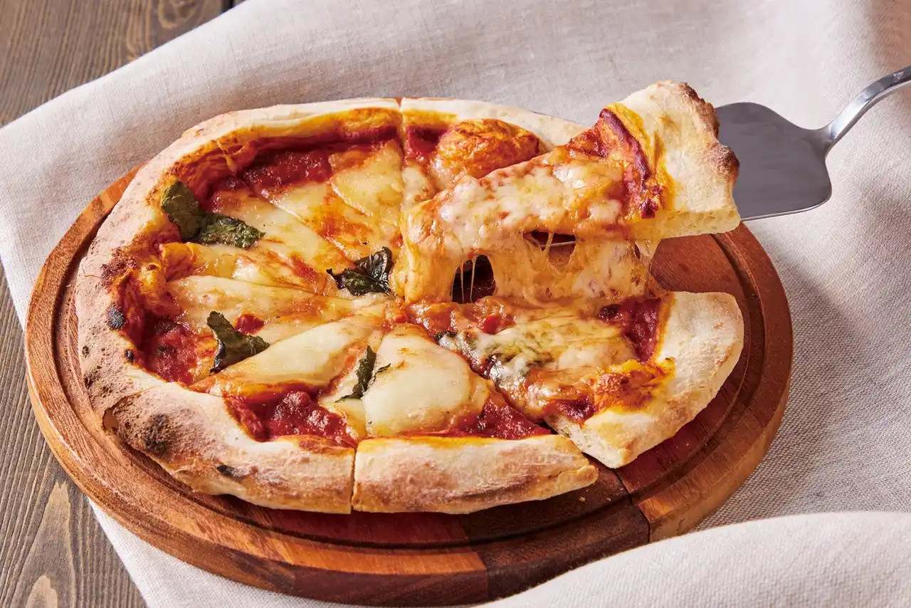 ピザ生地に使用している国産小麦をはじめ、トッピングには北海道産のモッツアレラチーズ、国産のバジルを使用しています。また、膨張剤はアルミフリーです。 |