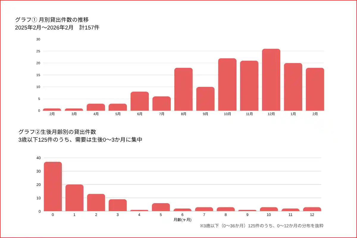 | 2025年2月に無償貸与事業を開始してから約1年、年間157件の貸出を行いました。 | |||||||