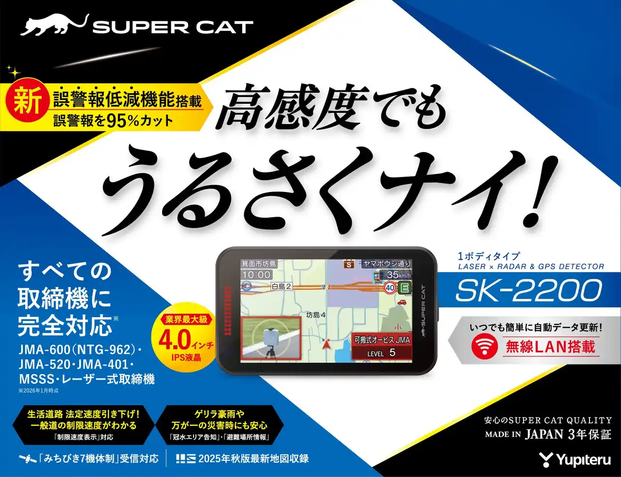 株式会社ユピテル(本社:東京都港区、代表取締役会長 兼CEO:安楽 憲彦、以下ユピテル)は、Kバンド識別性能の強化と、新誤警報低減機能の搭載により従来モデルと比較して誤警報を最大95%低減させた、レーザー&レーダー探知機「SUPER CAT」2026モデルを発売します。