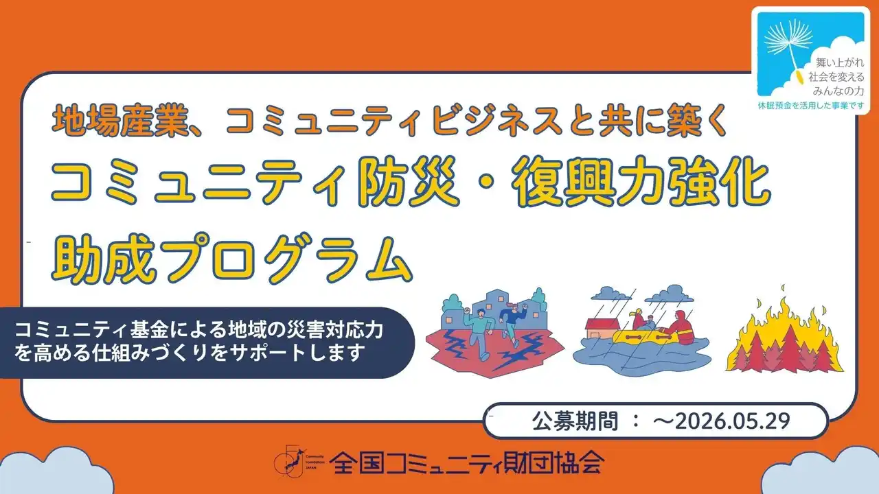 | 一般社団法人全国コミュニティ財団協会 (所在地:京都府京都市、会長:高橋潤)は、休眠預金等活用法に基づく資金分配団体として、「地場産業、コミュニティビジネスと共に築くコミュニティ防災・復興力強化助成プログラム」の公募を2026年4月10日(金)より開始しましたのでお知らせいたします。本事業では、1団体あたり約3年間で最大2,500万円の資金支援を行い、災害基金の設立・運営を通じて、平時から地域の防災力を高め、持続可能な地域づくりに貢献することを目指します。 | |||