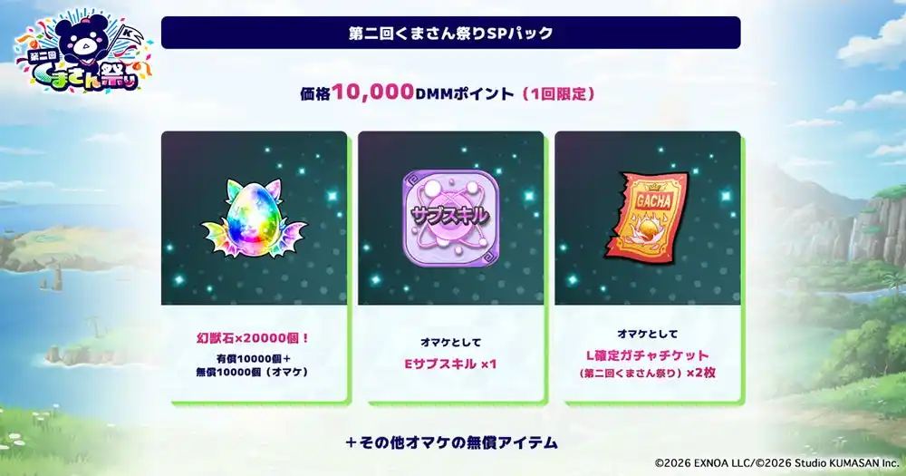 イベント開催期間中1回限定で、豪華アイテムがたくさん詰まった「第二回くまさん祭りSPパック」を10,000DMMポイントで販売します。 |