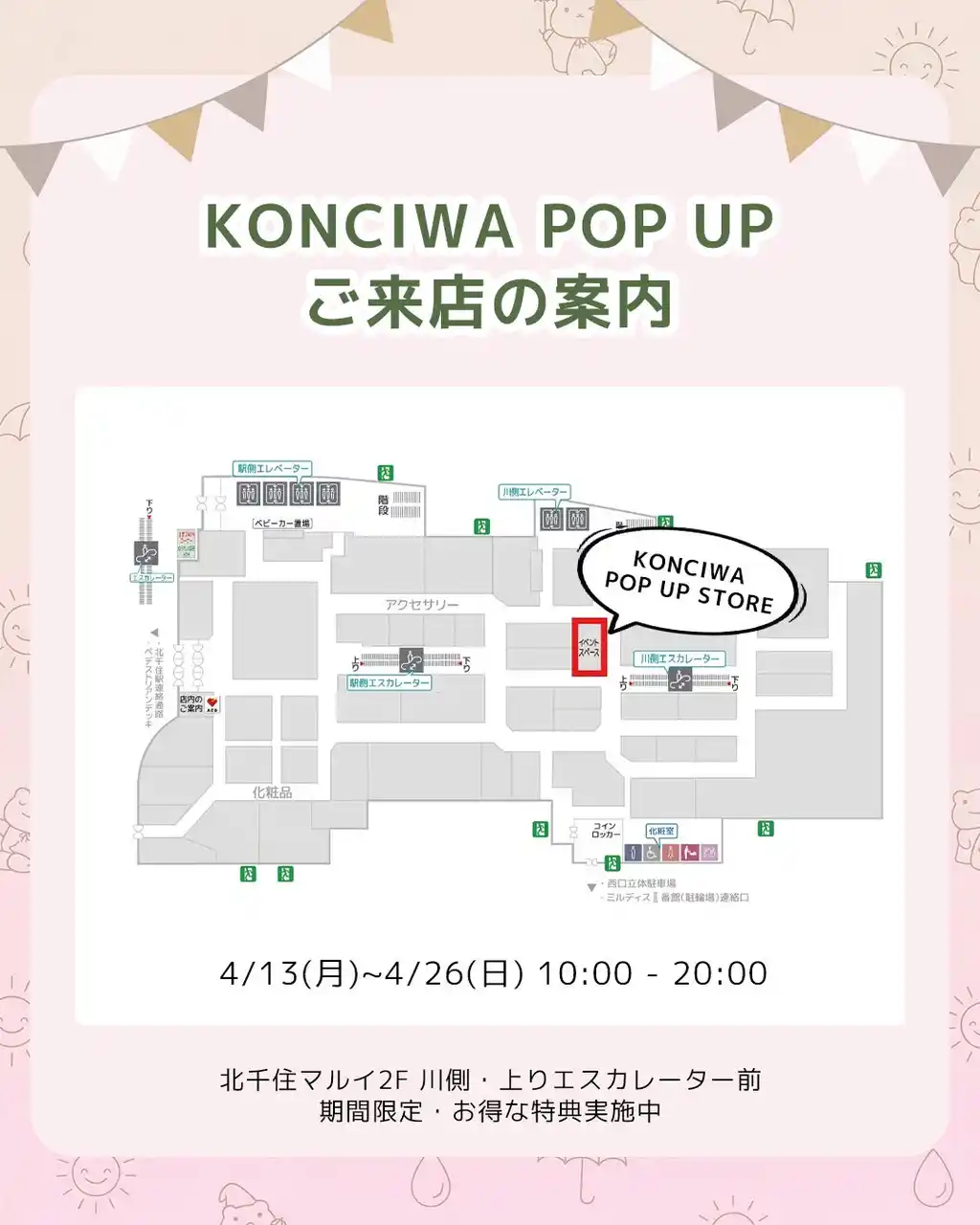 KONCIWA株式会社(本社:東京都本郷区)は、2026年4月13日(月)から4月26日(日)までの期間、北千住マルイ 2Fにて、期間限定ポップアップストアを開催いたします。 |