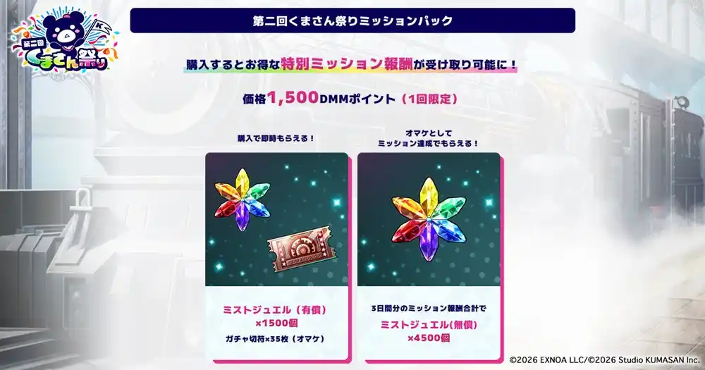 イベント開催期間中1回限定で、お得なログインボーナスが受け取り可能になる「第二回くまさん祭りミッションパック」を1,500DMMポイントで販売します。 |