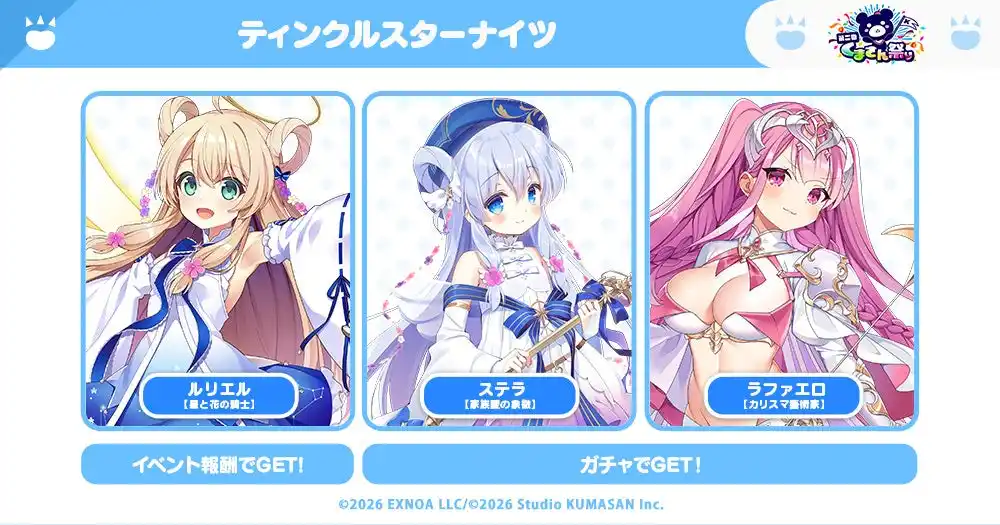 『第二回くまさん祭り』限定コラボキャラクターとして「【星と花の騎士】ルリエル」「【家族愛の象徴】ステラ」「【カリスマ藝術家】ラファエロ」が新たに登場します! |