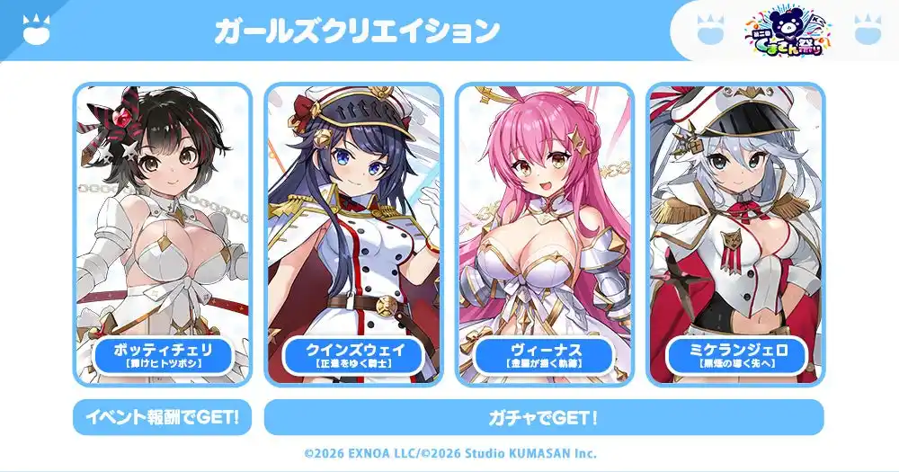 『第二回くまさん祭り』限定コラボキャラクターとして「ボッティチェリ【輝けヒトツボシ】」「クインズウェイ【正道をゆく騎士】」「ヴィーナス【金星が描く軌跡】」「ミケランジェロ【黒煙の導く先へ】」が新たに登場します! |