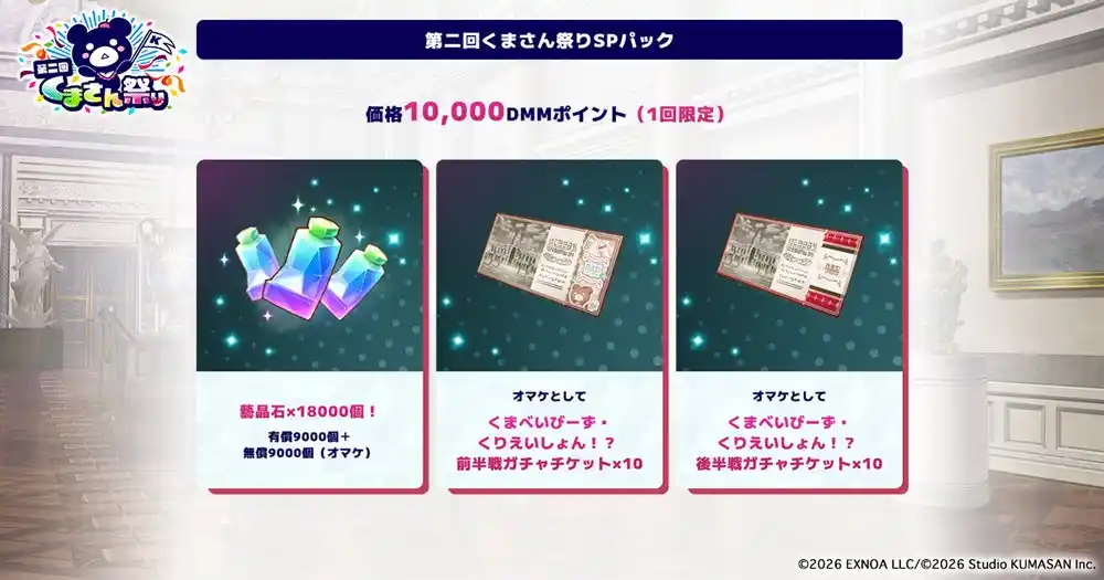 イベント開催期間中1回限定で、豪華アイテムがたくさん詰まった「第二回くまさん祭りSPパック」を10,000DMMポイントで販売します。 |