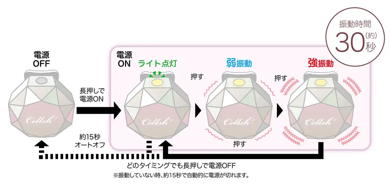 振動の強さは2段階あり、ボタンを押すと弱から強に変わります。初めは弱から、慣れたら強で!短時間で効果的なエクササイズを! |
