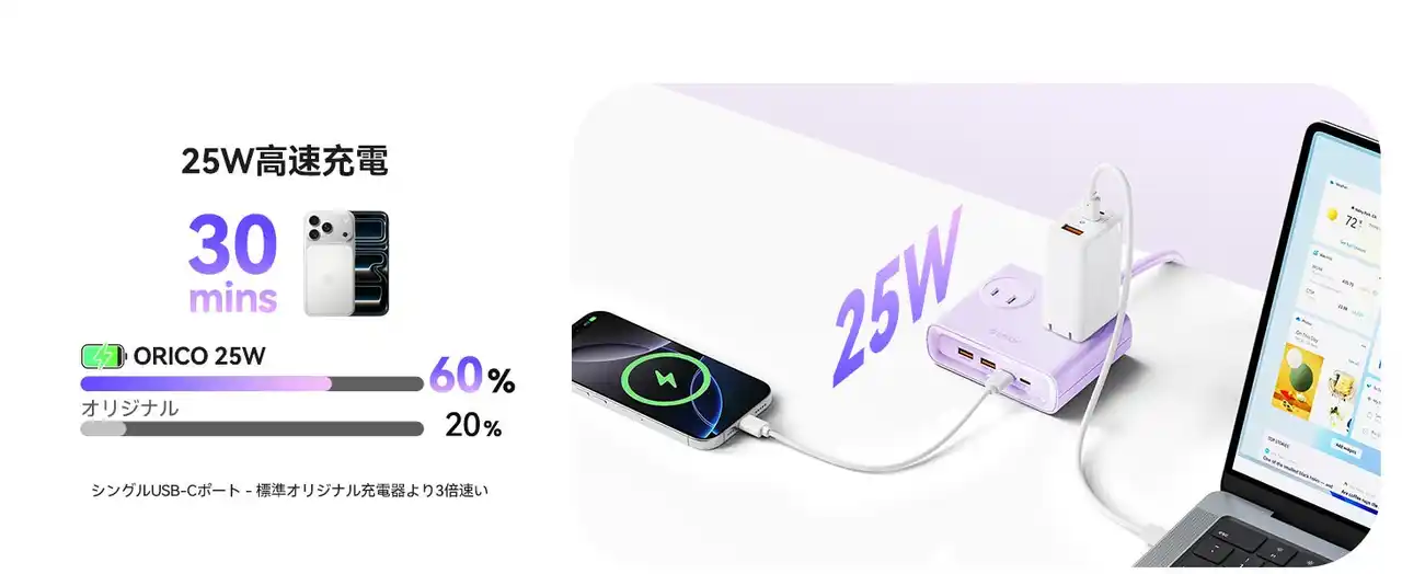 デスクの上が電源アダプターでごちゃごちゃしていませんか? 今回ご紹介するのは、洗練されたパープルカラーがお洒落で、最大8台のデバイスを同時に支える**ORICOの多機能電源タップ「小方砖」**です。 |