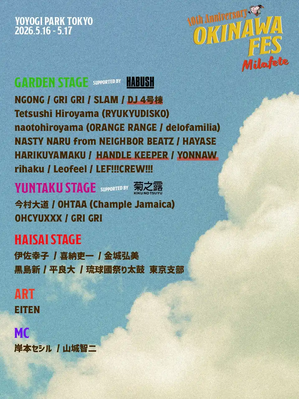 ミラフェート株式会社(所在地:沖縄県那覇市、代表取締役:笠井誉文)は、通算11回目、10周年を迎える「OKINAWA FES Milafete(オキナワフェス ミラフェート)」において、2026年5月16日(土)・17日(日)の2日間、東京都・代々木公園イベント広場にて開催される本イベントの全出演アーティストの発表を行ったことをお知らせいたします。 |