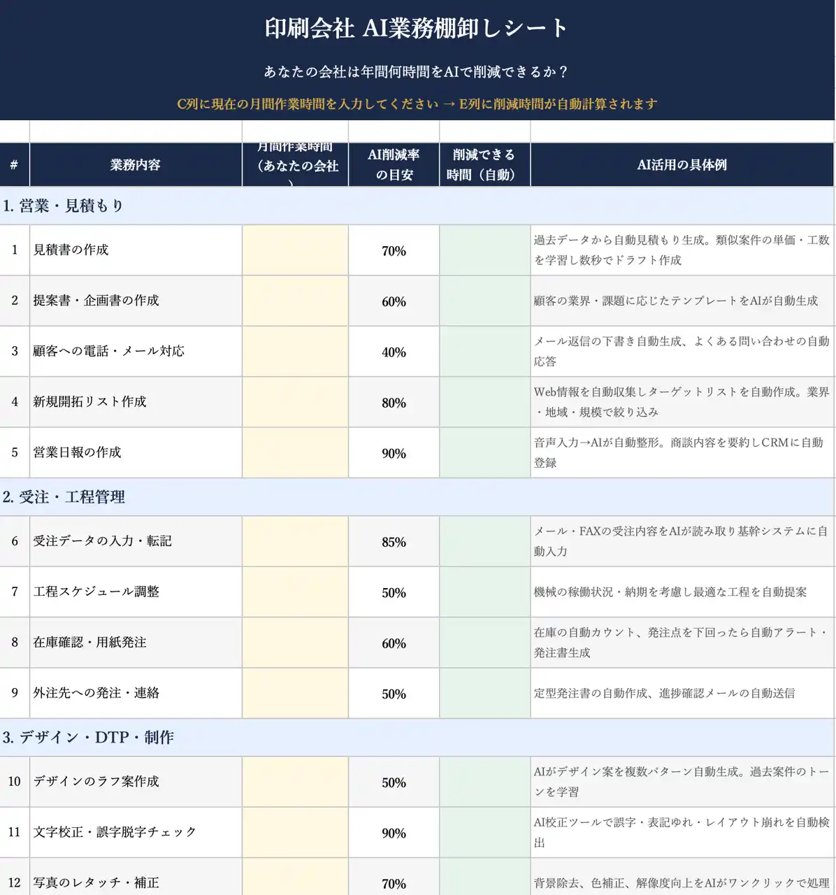 セミナー参加者全員に「印刷会社AI業務棚卸しシート」(Excel)を無料配布いたします。自社の業務30項目について月間作業時間を入力するだけで、AIによる年間削減時間と人件費換算額が自動計算されるツールです。希望者には無料個別診断(30分・オンライン)もご案内いたします。 |