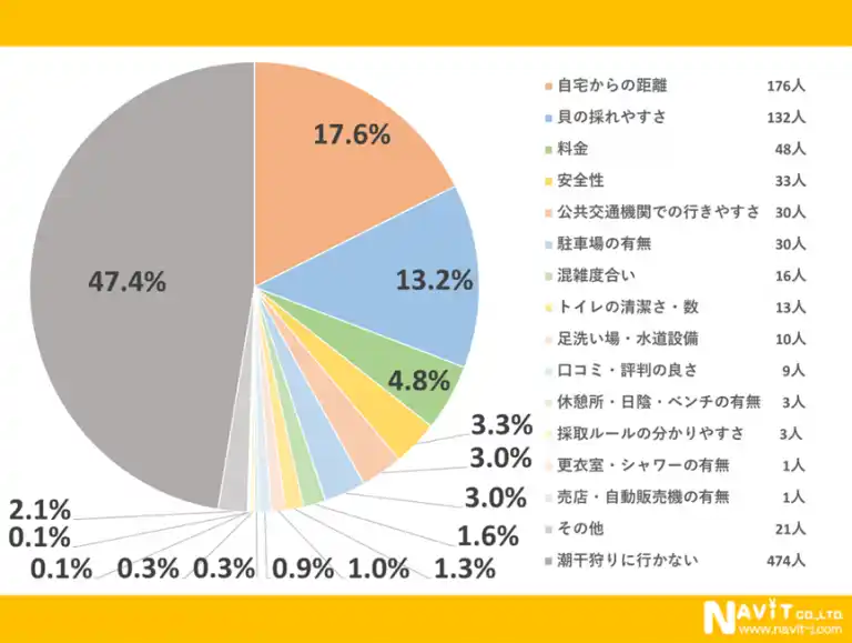 | 潮干狩りをする場所を選ぶ際に、最も重視する点についてのアンケート結果です。最も多かった回答は「自宅からの距離」で17.6%、次に多かったのは「貝の取れやすさ」で13.2%、3番目に多かった回答は「料金」で4.8%という結果になりました。潮干狩りに行くと潮風でベタベタするので、早く家に帰ってシャワーを浴びたりできた方がいい、ということでしょうか。 | |||