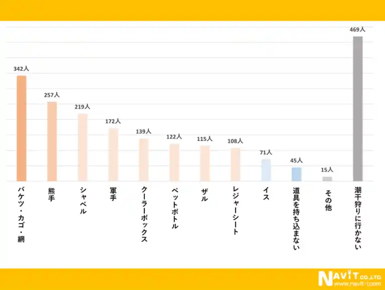 | 潮干狩りの際に自宅から持ち込む道具は何ですか?というアンケートを複数回答にて回答いただきました。「バケツ・カゴ・網」が342人、「熊手」と回答された人が257人、「シャベル」と回答された人が219人という結果になりました。潮干狩りに行くには、この3つは必須ということでしょう。 | |||