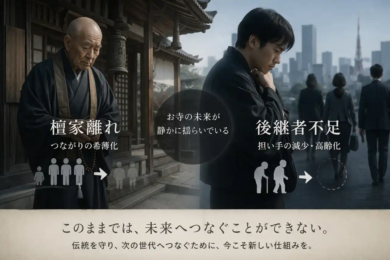 全日本仏教会の調査によれば、檀家制度の希薄化は年々加速しており、地方寺院を中心に「住職一人で複数の業務をこなす」「世代交代の担い手がいない」状況が深刻化しています。 |