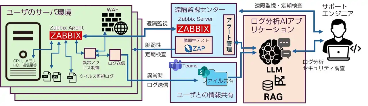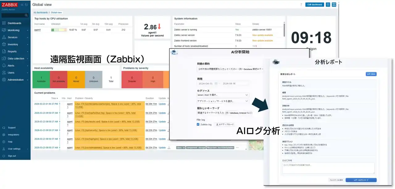 AIログ分析:Zabbixやその他該当サーバから送信されたログを生成AIによって分析の支援を行う。アラートや収集ログの要約・相関から問題点の追及を支援(原因候補、影響範囲、次アクション案の提示)。 |
