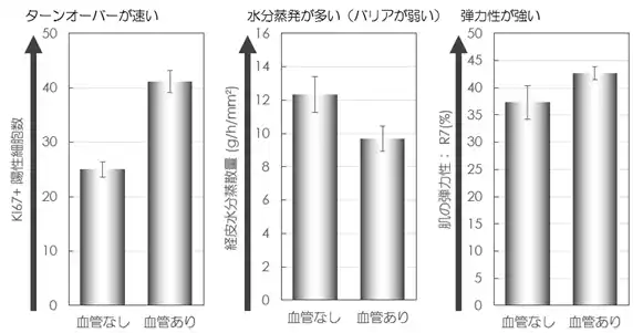 | 次に、血管の有無による人工皮膚の機能性を比較しました。その結果、肌の保湿バリア機能、透明感等に重要な役割を果たすターンオーバー機能、しわたるみに関わる肌の弾力性について、血管付与による改善が認められました(図3)。 | |||