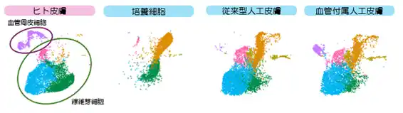 | 一般的な人工皮膚は、表皮角化細胞と真皮線維芽細胞の2種の細胞からなる、表皮と真皮の2層モデルです。まず研究チームは、表皮角化細胞、真皮線維芽細胞、臍帯由来血管内皮細胞の3種の細胞を用いて血管構造を持つ人工皮膚モデルを構築しました(図1)。次に、構築した人工皮膚に含まれる細胞を対象に単一細胞RNAシークエンス解析を実施し、真皮に含まれる細胞の性質と多様性を評価しました。 生体ヒト皮膚の真皮には多様性のある線維芽細胞と血管周皮細胞が含まれますが、研究用にこれらの細胞を平面培養した細胞では多様性が喪失されていました。その一方で、構築された人工皮膚の線維芽細胞と血管周皮細胞の多様性分布パターンが生体ヒト皮膚と非常に類似したパターンであることが確認されました(図2)。この結果は、従来困難とされていた線維芽細胞と血管周皮細胞の細胞不均一性の再現には、三次元環境と血管と皮膚の細胞間相互作用が重要な役割を果たすことを示しています。 | |||