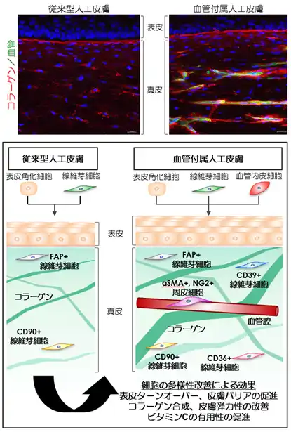 | ◆血管内皮細胞との共培養により、生体同様の真皮細胞の多様性を再現した人工皮膚を開発 | |||