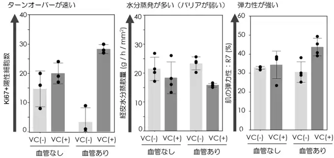 | ・ビタミンCのターンオーバー改善、肌弾力改善作用は、血管付属人工皮膚で増強される | |||