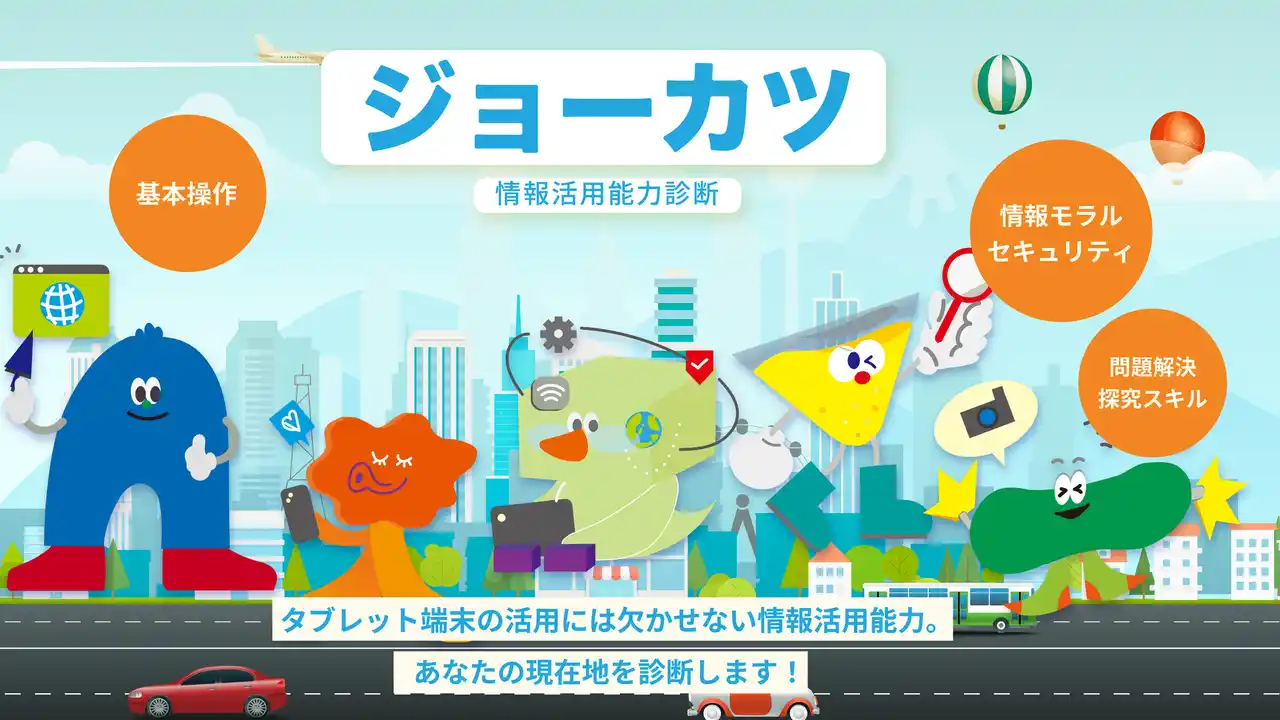 「ジョーカツ」は、小学生から中学生を対象に、PCやタブレット、インターネット活用を軸とした情報活用能力を診断するツールです。文部科学省が提示する情報活用能力体系表例に基づき、1.基本操作、2.問題解決・探究スキル、3.メディアリテラシー、4.クラウドに関する知識、5.情報モラル・セキュリティの3つの領域で構成される質問への回答を基に自治体・学校・児童生徒の情報活用能力の「現在地」を定量データとして可視化します。 |