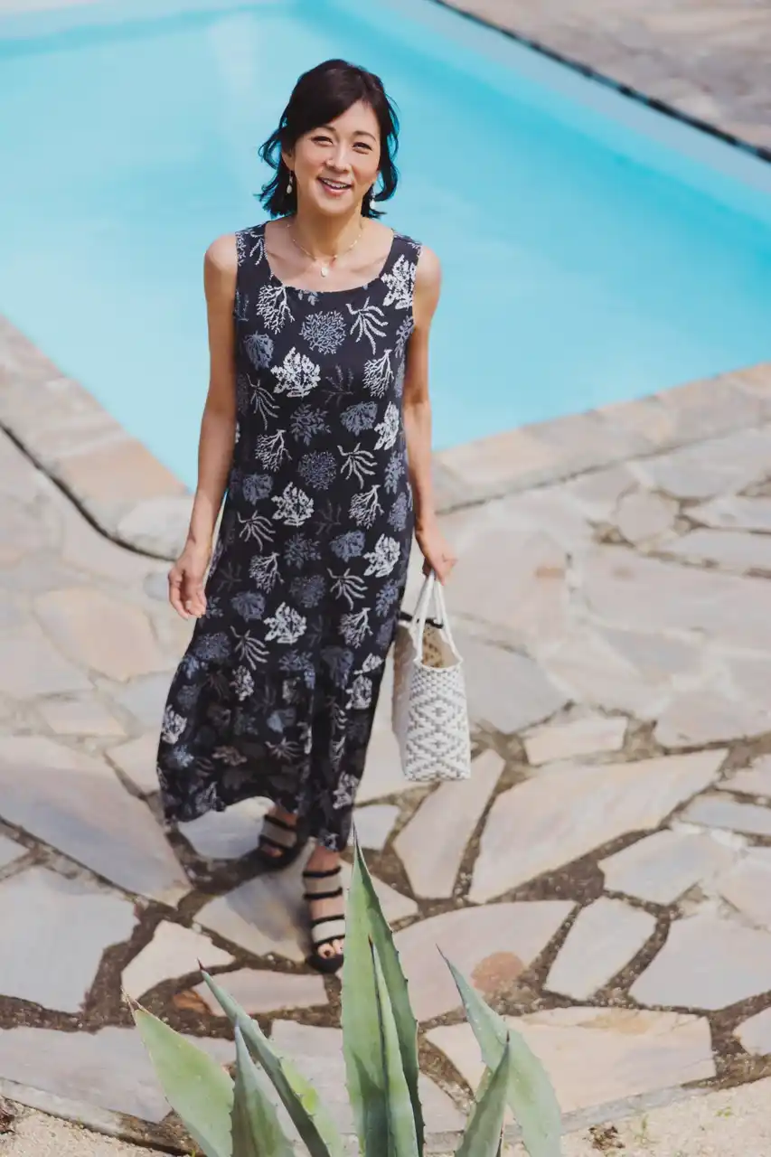 リゾートでは、着ごこちがよくてシルエットをきれいに見せてくれるアイテムを選ぶようにしています。今回のアイテムの中では、[ノースリーブロングワンピース]と [楊柳前あきワンピース]は欠かせないですね。どちらも一度着ると色違いが欲しくなるほど快適ですし、流行に左右されないデザインなので長く愛用できます。 |