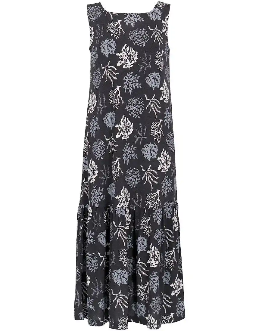 ●[ノースリーブロングワンピース]と[楊柳前あきワンピース]、[カップ付きタンクトップ]をラインアップ。繊細なサンゴモチーフを組み合わせた夏らしい柄を採用し、華やかさと上品さを兼ね備えたデザインに。