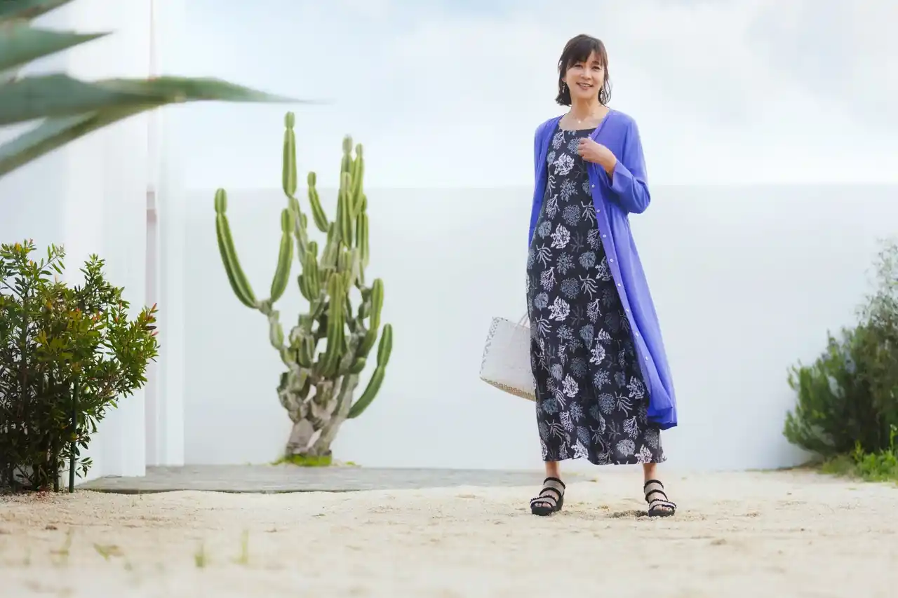 三浦りさ子さんとは、旅をイメージしたコンセプトの立案から柄の選定、細かなフィッティング確認まで協業。気になりがちな部位をさりげなくカバーするパターン設計にこだわり、アウターアイテムと組み合わせることで、体型カバーとコーディネイトのしやすさを両立しています。 |