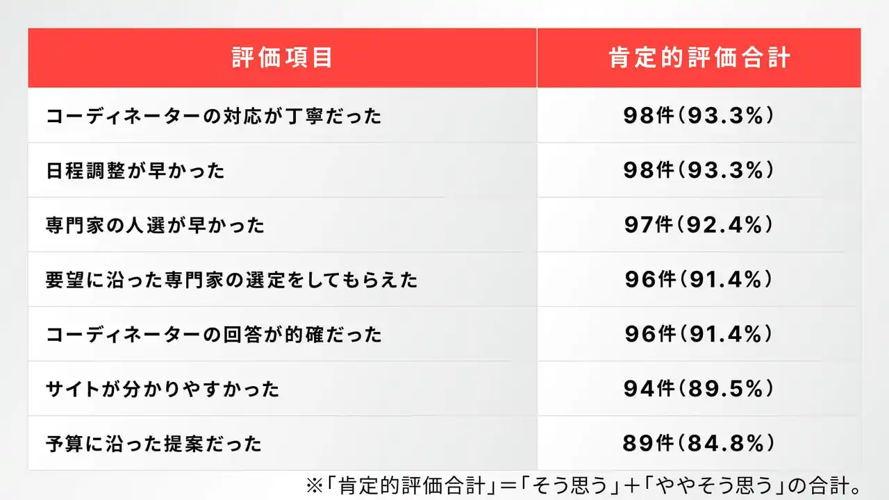お客様の細かな要望を汲み取るコーディネーターのヒアリング体制強化に加え、小規模事業のお客様のニーズに応えるプランを拡充するなど、多角的なサービス改善によってマッチングの精度と納得感が向上したことが、即決率を押し上げる要因となっています。 |